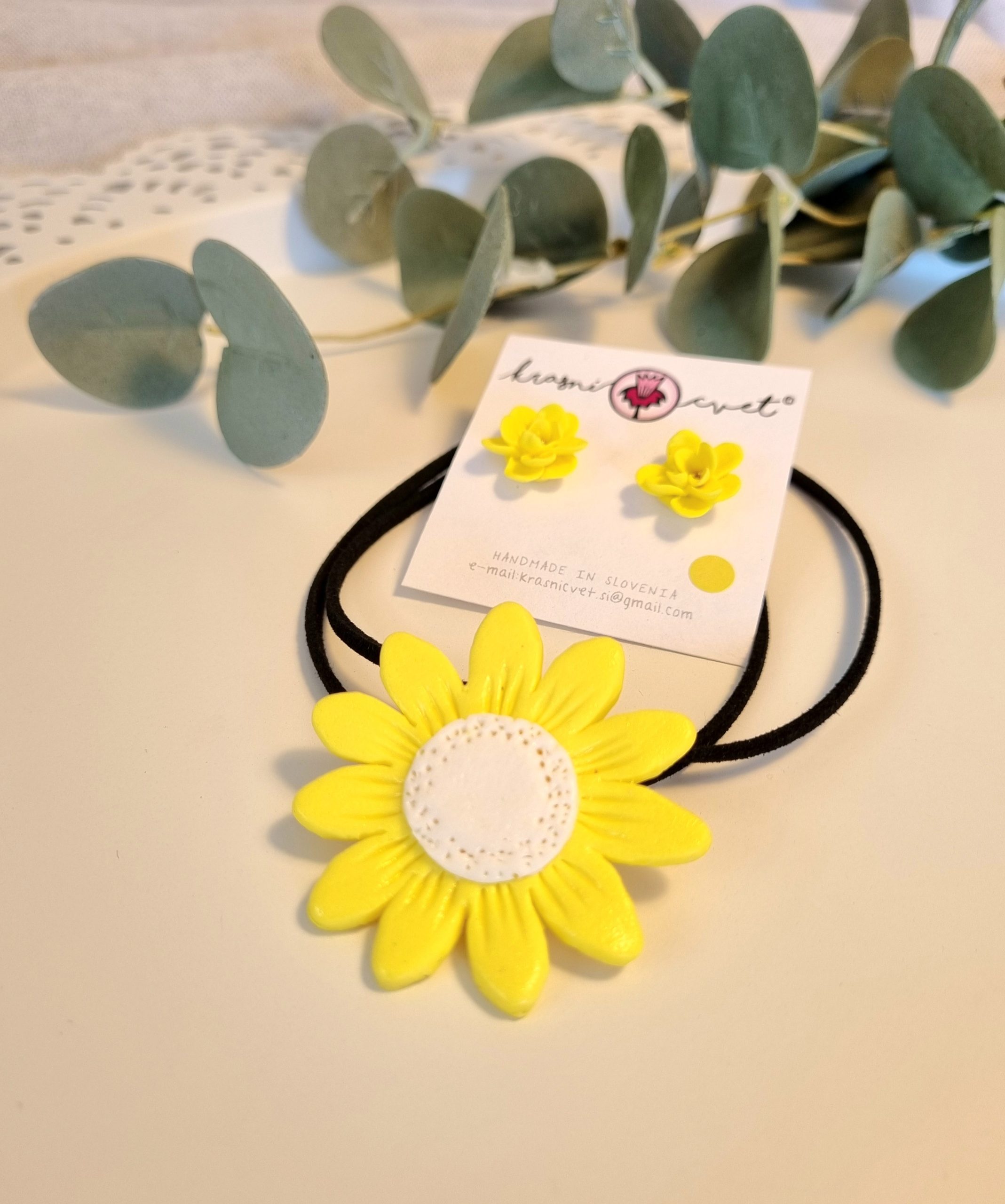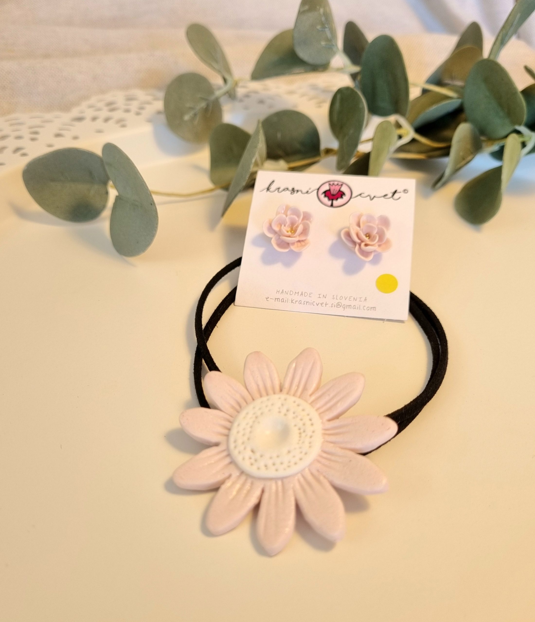 Komplet vsebuje mini uhane in ogrlico. Trenutno na zalogi v dveh barvah (rumena in nežno roza).