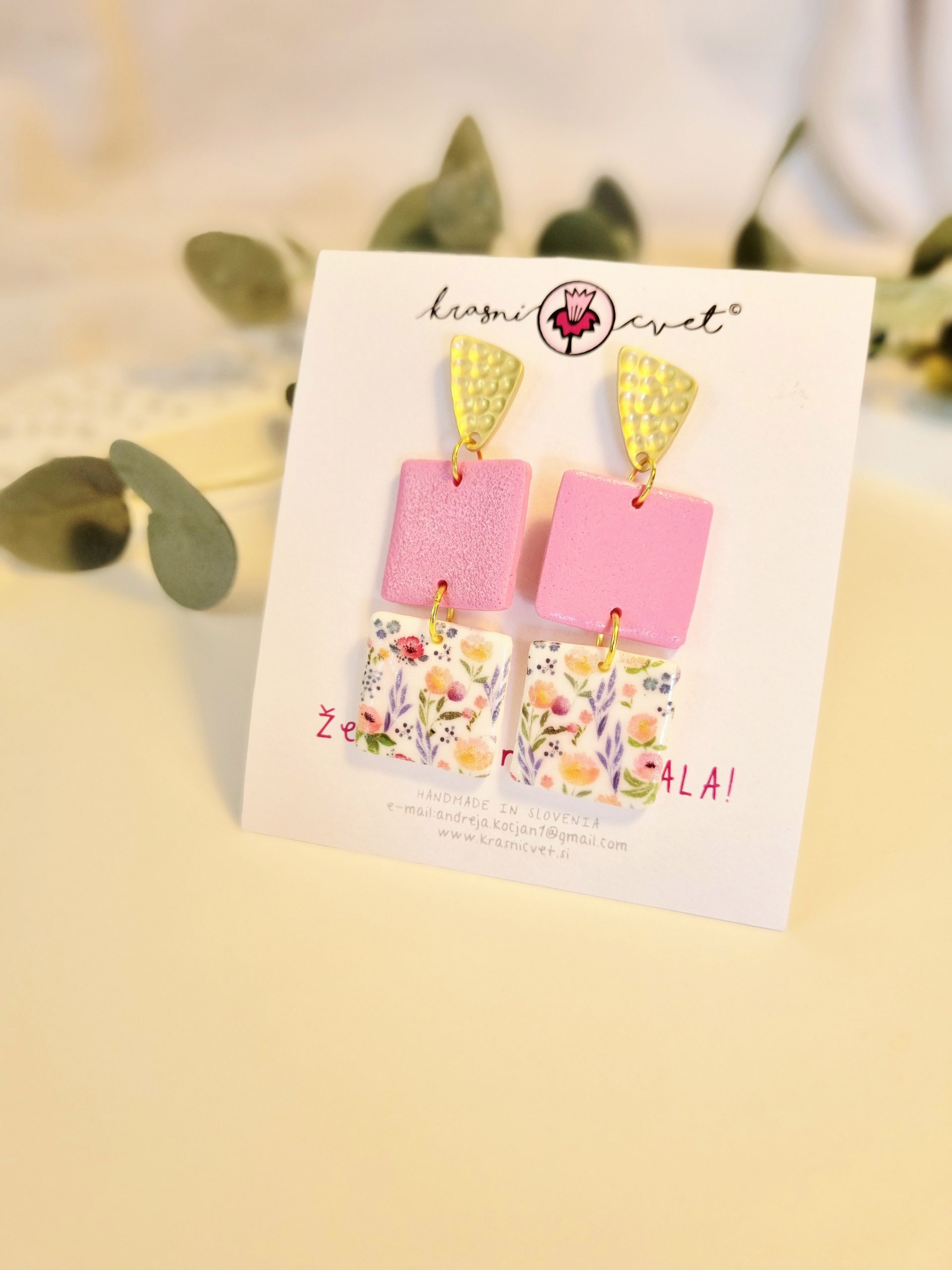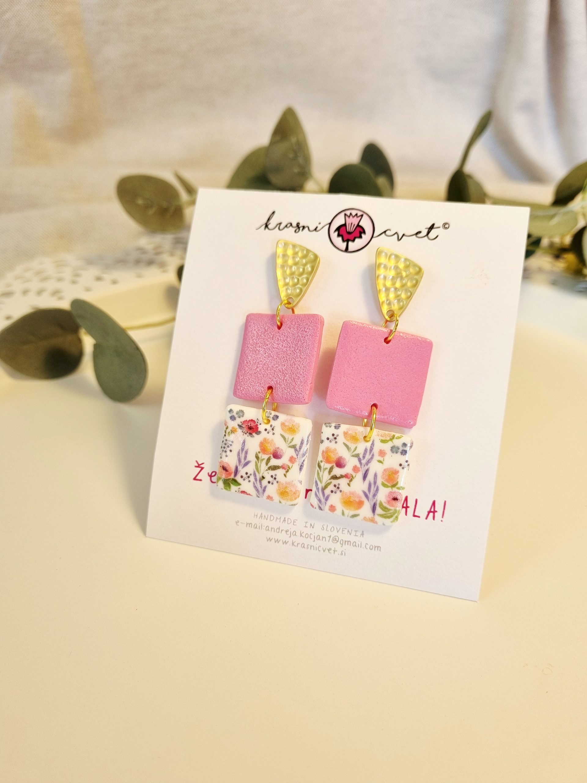 Viseči uhani. Roza kvadrati z dodatkom zlatih kovinskih delov.