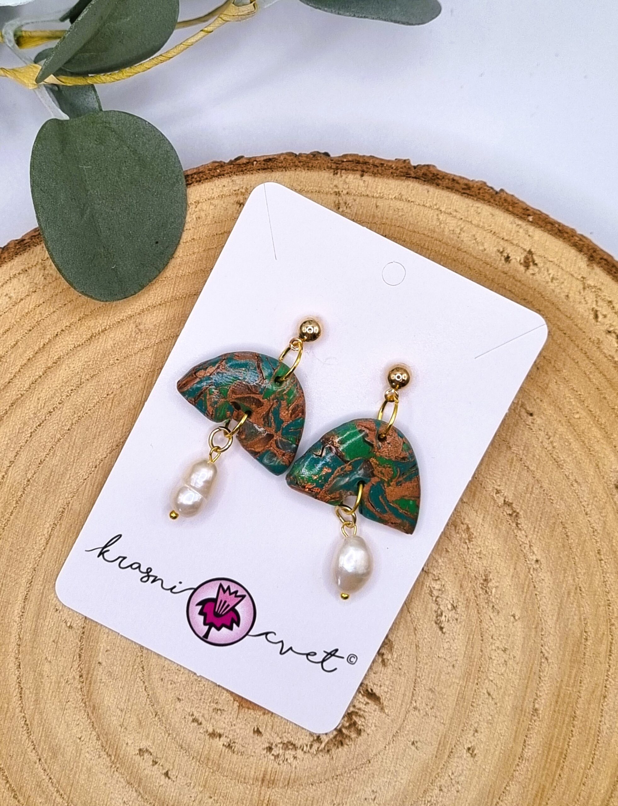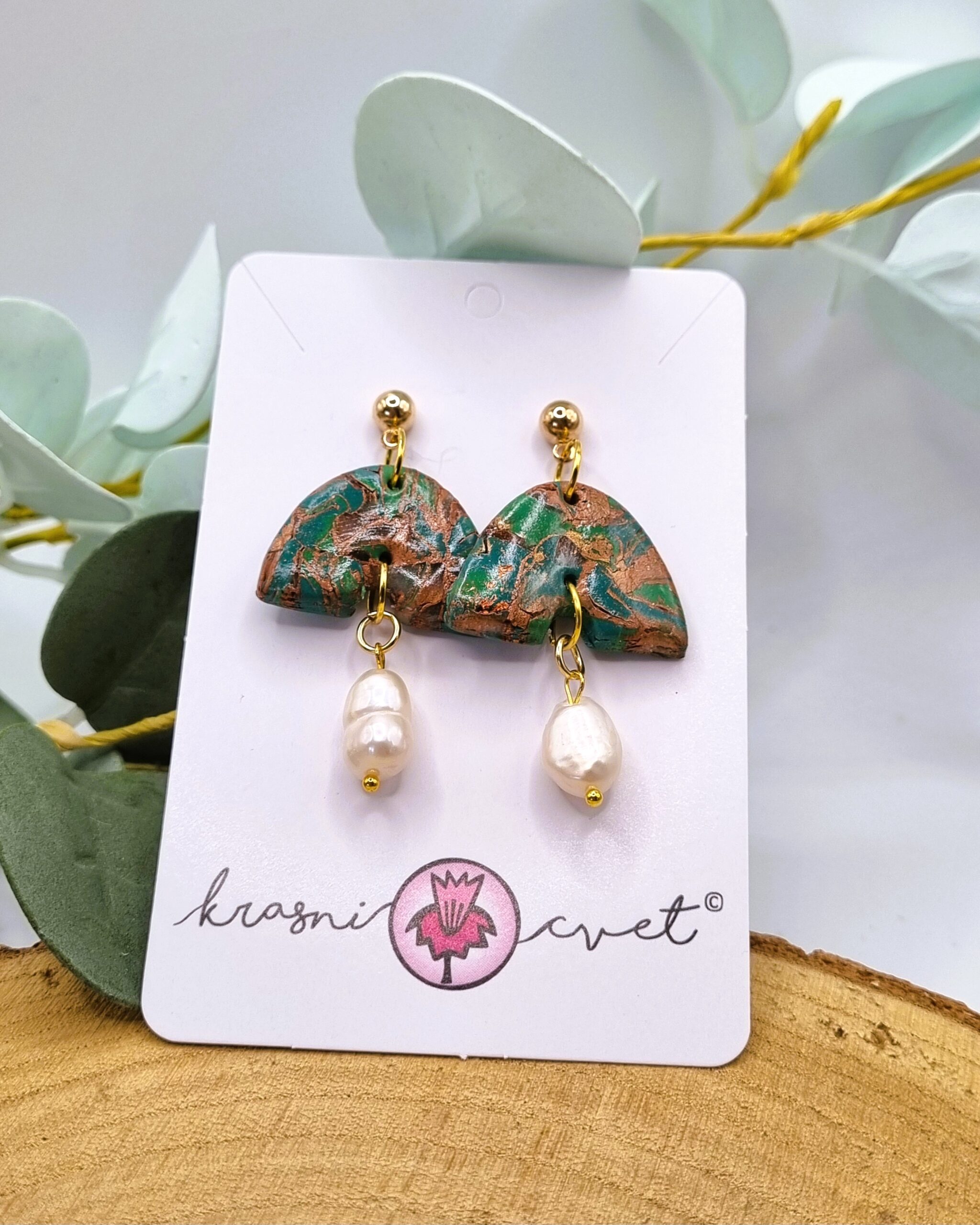 Zlati kovinski deli so iz nerjavečega jekla, zato ne dražijo ušes. Preprosta oblika mavrice, viseči biser ter prekrasne prelivajoče barve zelenih in zlatih odtenkov, bodo poskrbeli za popoln outfit.