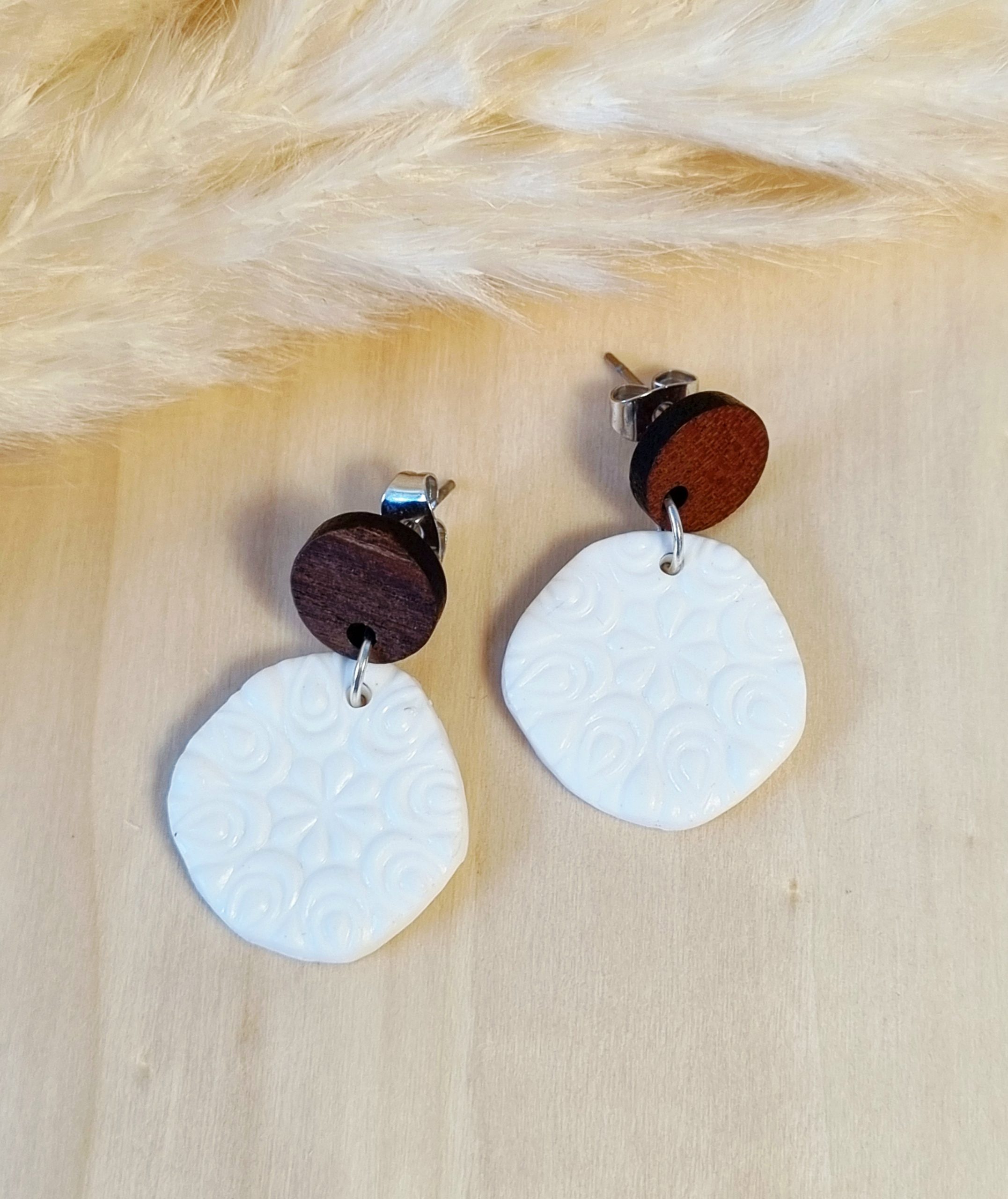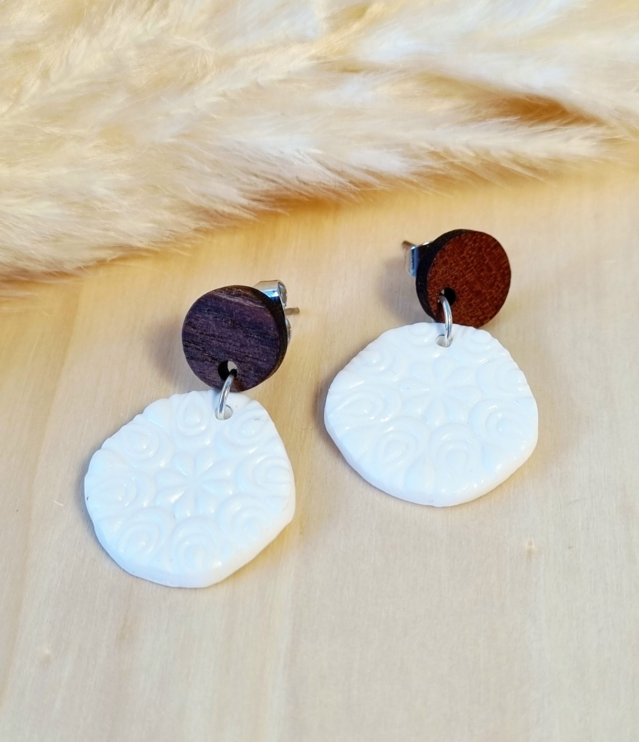 Viseči uhani z reliefom čipke in z dodanim lesenim nastavkom, so elegantni in minimalistični ter primerni za različne priložnosti.